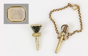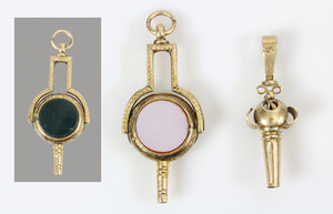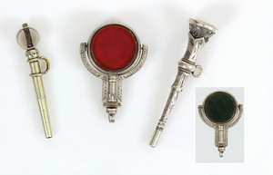 Lot: 3 Taschenuhrenschlüssel, 1 x Metall, 2 x Silber: 1 x mit Ratsche H = 42,5 mm; 1 x mit drehbarer Steinfassung (Carneol / grüner Heliotrop), L = 47 mm; 1 x mit weißer Achatplatte, H = 49 mm, Schlüssel mit feiner Gravur