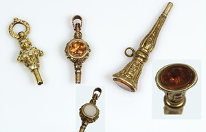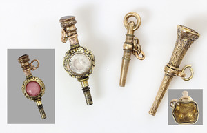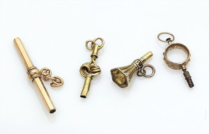 Lot: 4 Gold-Taschenuhrenschlüssel, 1 x GG 333/000, 3 x GG 750/000 (1 x mit Schmuckstein)