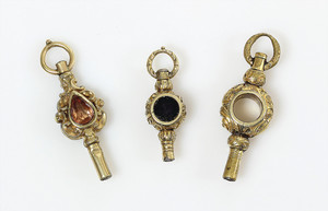 Lot: 3 Gold-Taschenuhrenschlüssel, alle GG 585/000, 1 x mit Ratsche, L = 30 mm, 1 x mit fac. Weißen Stein u rosa Cab., L = 36,5 mm, 1 x gelben Schmucksteinen mit graviertem Wappen, L = 38 mm