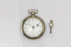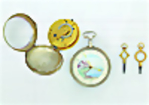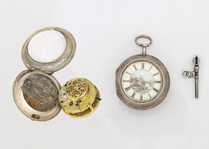 Spindeltaschenuhr, WILL LANDER LONDON 17835, England Ende um 1800. Silbergehäuse, Rückseite mit Ritter Szene, Elfenbeinzifferblatt mit Landschaftsszene: Häuser, Fluß und Berge (Zifferblatt wohl etwas später, Deckel schließt nicht korrekt), röm. Zahlen, feuervergoldetes Vollplatinenwerk mit filigran gearbeiteter Spindelbrücke, 1 Schlüssel, D = 48,5 mm, Uhr läuft