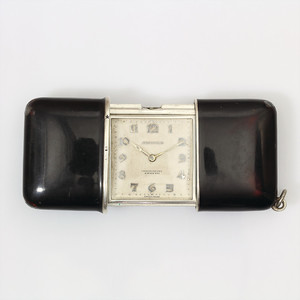 Reise-Taschenuhr ART-DECO 20/30er Jahre, MOVADO-ERMETO, Silber 935/000, schwarzer Emaillelack, arab. Zahlen, die Uhr wird durch Zusammenschieben und Auseinanderziehen aufgezogen, wahlweise auch über die Krone, durch eine Öse kann eine Kette gezogen werden, 47,0 x 33,5 mm im geschlossenem Zustand, Uhr läuf