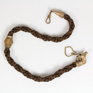 Haar-Uhrenkette, Ende 19.Jhd., Metall doubliert, ein Ende mit Hirschkopf mit Geweih, das andere Ende mit Karabiener, 1 Ziehrelement, L = 43,5, guter Originalzustand