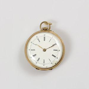 Zylinder-Damentaschenuhr, GG 585/000, E.Z.Blatt mit leichten Außbesserungen, röm. Std. u. arab. Min. Index, D = 32 mm, Aufhängung nachträglich umgearb., Uhr läuft