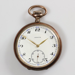 Herren-Taschenuhr, ZENITH um 1900, Silber 800/000, sehr gut erhaltenes E.Z.Blatt, feine goldene Zeiger, arab. Index, kl. Sek. Auf 6 Uhr, Breguetspirale, Schwanenhals Feinregulierung, D = 49 mm, 2 Kupferfarb. Bänder um das Gehäuse, Kunststoffglas, (Aufzug nicht in Ordnung !), Uhr läuft