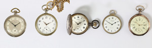 Lot: 5 Herren-Taschenuhren, 1 x ANKER, Metall SHOCKPROOF von oben zu Öffnen, 1 x KIENZLE mit kl. Sekunde auf 6 Uhr, 1 x ARSA kl. Sekunde auf 6 Uhr, feine gebläute Zeiger, im Deckel kleineres Glas; 1 x Metalltaschenuhr mit verg. Uhrenkette, L = 26,5 cm; 1 x silberne Zylinder-Taschenuhr, D = 42,5 - 49 mm, 1 Uhr läuft an, 4 Uhren laufen