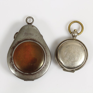 Lot: 1 x Metall-Taschenuhrengehäuse mit Kunststoffglas, innen mit Filz ausgelegt, H = 74,5 cm; 1 x Metallgehäuse mit Sprungdeckel, oben zarte Gravur, D = 38 mm