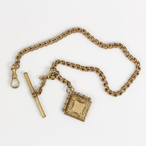 Taschenuhrenkette, Metall verg., Karabiner, Knebel u. Anhänger (quadratisches Medaillon), L = 33,5 cm