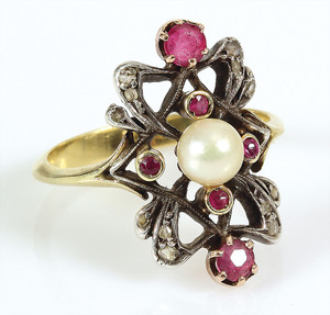 Ring JUGENDSTIL, Wien um 1900, GG 750/000, Ringkopf Silber, 1 Perle D = 5,2 mm, 12 Diamantrosen (teilweise beschädigt), 6 Rubine fac., RW ca. 56
