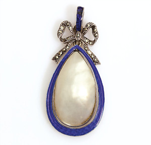 Anhänger, JUGENDSTIL, Frankreich um 1890/1910, Silber, 1 Tropfen-Mabeperle, Makasiten (1 Stein fehlt), bl. Emaille, H = 42 mm