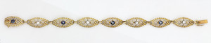 Armband, Frankreich um 1910, JUGENDSTIL, Elemente mit girlandenartiger Umrandung, GG 750/000, 4 Saphire ca. 1,4 ct., 4 Altschliff-Diamanten ca. 0,45 ct, L = 19,5 mm