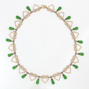 Collier-Kette, frühes 20.Jhd., Frankreich ?, GG 750/000, 16 grüne Achat-Pampeln, 17 Diamanten, ca. 0,35 ct, weiß (1 Stein fehlt), in Ag gefasst, L = 46 cm