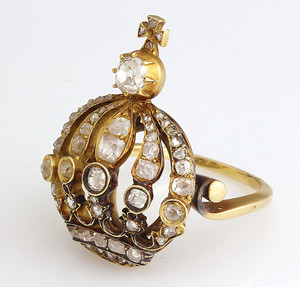 Sehr ungewöhnlicher Ring um 1800, Frankreich, GG 750/000, Altschliff-Diamanten & Dianmant-Rosen (2 Steine fehlen), wohl aus einem Adelshaus verliehene Nadel, wurde um 1900 als Ring umgearbeitet wurde, feine Fassarbeiten, RW ca. 51,5, sammelwürdig !