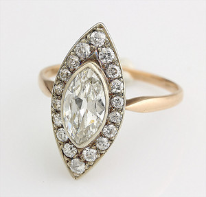 Ring, feines ART-DECO um 1910/20, RG 585/000, Pt, Diamant-Navette ca. 1,35 ct w-vsi/si, 16 Altschliff-Diamanten ca. 0,64 ct tw/w-si/p, 2 Diamanten tw/w-p (alt ersetzt), RW ca. 58,5