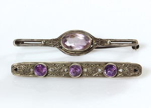 Lot: 2 Nadeln um 1920, wohl Pforzheim, Nadel, Silber, 3 Amethyste, L = 55,5 mm, Nadel, Silber 835/000, 1 ovaler Amethyste = 56 mm