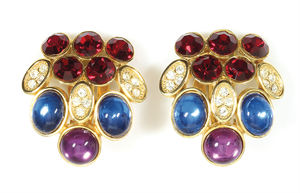 Farbige Ohrclips von SPHINX (signiert). Rote, blaue, violette und klare Glas- und Strasssteine in unterschiedlichen Formen.