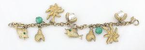 Bettelarmband von Sarah Coventry (signiert Sarah Cov.). Maritime Anhänger (Fische, Muscheln, Algen etc.). Goldfarben mit grünen Akzenten und 2 Kunstperlen. L = 18,0 cm