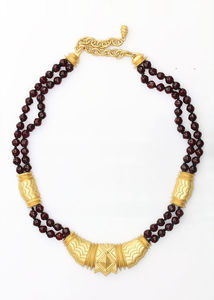 Goldküsten-Collier von Franklin Mint (sig. FM 90 für Franklin Mint 1990). Entwurf von Mary McFadden. Das Collier ist aufwendig vergoldet und mit zweireihigen granatfarbenen Glasperlensträngen versehen. Mit Beschreibungen und Original-Karton. Gesamtlänge 63 cm