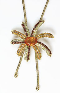 Goldfarbene, längere Schlangenkette unsigniert mit großer, plastischer Strassblüte in Braun- und Orangetönen als "Kettengleiter". In der Mitte mit einem großen, geschliffenen Stein in Orange. Massiv und wertig gearbeitet. L = 67 cm