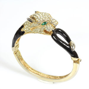 Armreif "LEOPARD", Metall verg., nicht sign., weißer u. grüner Strass, schwarzer Emaillelack, Kastenschloß, Innenmaß 59,5 x 48 mm