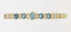 Armbanduhr, Metall vergoldet, Türkisimitationen, Strichindex, Handaufzug, L = ca. 17 cm, Uhr läuft