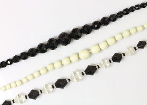 Lot: drei böhmische Glasketten, 1.Hälfte 20.Jhd., 1 x schwarz facettierte Kugeln im Verlauf, L = 49,5 cm; 1 x cremefarbene Kugeln im Verlauf, L = 49 cm; 1 x schwarz/weiß facettiertes Glas im Verlauf, L = 42 cm