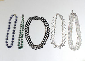 Lot: 5 böhmische Glasketten, 1 x 3-reihig weiß, L = 40 cm; 1 x weiße Pampeln, L = 39 cm; 1 x blaues Glas, L = 39 cm; 1 x grün / weiß facettiert mit Silberschließe, L = 38 cm; 1 x schwarzes Glas geflochten mit Strassaplikationen, L = 42 cm