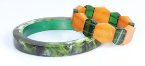 Lot: 1. Hälfte 20. Jhd., Armreif, grün mamorierter Kunststoff, Innen D = 68,5 mm; Armband auf Zugband gefädelt, mehrfarbiger Kunststoff ( orange / grün), Innen D = 50,5 mm