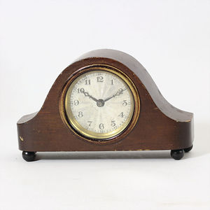Miniatur Tischuhr, 1920/30er Jahre, gouillochiertes Z.Blatt., Einsteckwerk, dkl. gebeiztes Gehäuse mit schwarzen Kugelfüßen, H = 8 cm, Uhr läuft