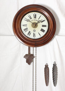 Schwarzwalduhr Ende 19.Jhd., E.Z.Blatt, "D.R.PATENT, LFS im Zahnrad Schutz Marke", röm. Zahlen (außen), rundes Holzgehäuse, D = 24 cm, Aufzug über Kette, Schlag auf Glocke