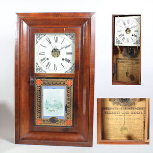 Amerikanische Wanduhr um 1900, WATERBURY CLOCH COMPANY, 1 Tagewerk, Gewichte laufen über innenliegenden Rollenzug, Ziffernblatt mit röm. Zahlen, Stundenschlag auf Rundgong, Holzgehäuse, Tür mit Hinterglasmalerei, 65,5 x 39 x 10,8 cm