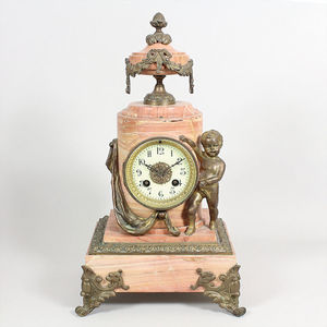 Kaminuhr, Frankreich Mitte 19.Jhd., E.Z. Blatt mit arab. Zahlen, Applikationen aus Bronce, seitlich stehender Putto, angeschmiegt an das rosafarbene Marmorgehäuse, Sockelfüße mit stilisierten Löwenköpfen, 1/2 Std.Schlag auf Glocke, Uhr muß vom Uhrmacher nachgeschaut werden, H = 39 cm