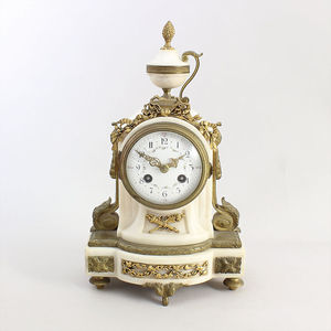 Französische Kaminuhr, weißer Marmor auf vier Füßen, 2.Hälfte 19.Jhd., sign: L.CHARVET LYON, E.Z. Blatt mit arab. Zahlen und zartem Blütendekor, Akanthusblatt, Fackeln u.Bändernapplikationen, 1/2 Std. Schlag auf Glocke, hinten mit Glasdeckel, H = 29,5 cm, 1 Applikation fehlt !, Uhr läuft