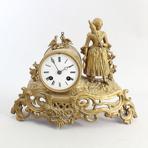 Französische Kaminuhr, Bronze gegossen und vergoldet, 2.Hälfte 19.Jhd., auf der Rückseite signiert: TARDY & Cie, Korpus mit figürlichem Aufsatz , liebliche Szene mit Spinnerin, zwei Tauben und Blumendekor, E.Z. Blatt mit röm. Zahlen, französisches Pendelwerk, ½ Std. Schlag auf Glocke, seperater Schlüssel für Feinregulierung, H. ca. 24.0 cm, B. ca. 29 cm, Uhr läuft