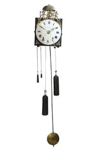 Comtoise FRANKREICH mit Wecker um 1830/40 sig: DOMBEY A BEAUREPAIRE. Metallgehäuse, 2 Putti halten Sonne, weißes E.Z mit röm Index auf 6 u. 12 Uhr arab. Zahlen, 1/2 Std. Schlag auf Glocke (oben auf Gehäuse), Wecker wird über Scheibe gestellt, seperater Antrieb über zwei kleine Gewichte, 39,5 x 24,5 x 15 cm (ohne Pendel gemessen), 1 Uhrenschlüssel( Kurbel), Uhr läuft