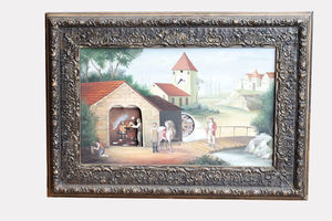 Bilderuhr mit Automaten, Marke "EIGENBAU" !, Rahmen Anfang 20. Jhd., Schmiedeszene mit Kirche und Schloss auf Sperrholz gemalt (Mitte 20. Jhd.), Verwendung von einfachen Weckerwerken 1920/30 Jahre, Automaten werden über einfachste Übersetzungen betrieben, Maße 73,5 x 52,5 x 11,3 cm