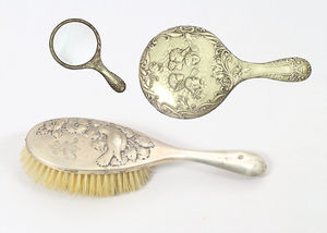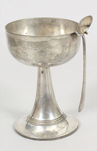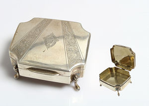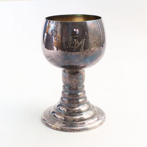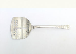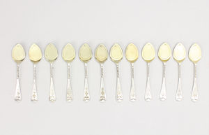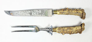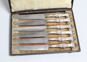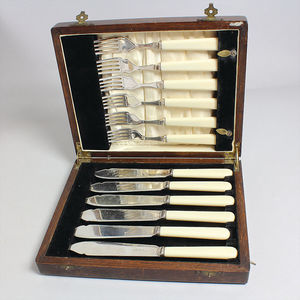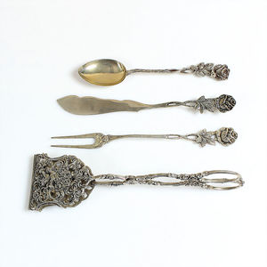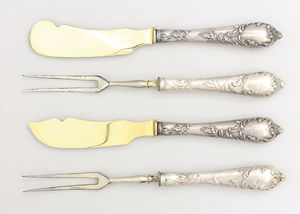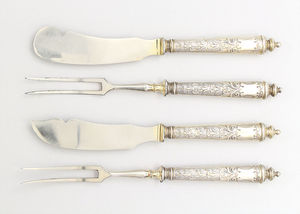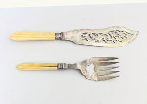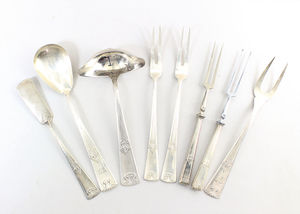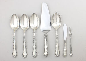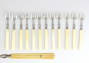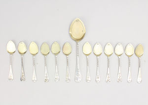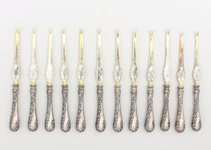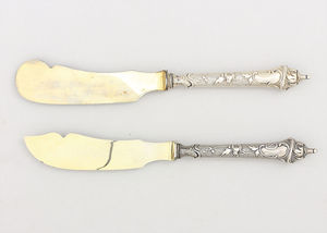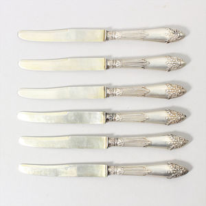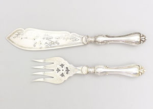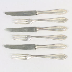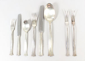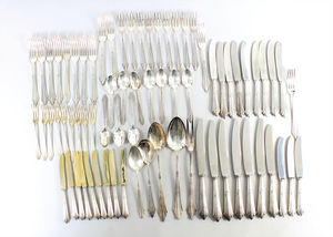 Eßbesteck 73 Teile: WMF FÄCHER, 90 Auflage, 9 x Kuchengabeln, L = 16 cm, 10 Kaffelöffel, L = 14 cm, 12 Dessertgabeln, L = 18,2 cm, 12 Dessertmesser, L = 20,3 cm,1 x Dessertlöffel, L = 18,5 cm, 7 x Messer, L = 25,5 cm, 1 x kl. Vorlegelöffel, L = 19,7 cm, 2 x gr. Vorlegelöffel, L = 25 u. 26 cm, 1 x Fleischgabel, L = 25,3 cm; Obstbesteck je 9 x Gabeln, L = 14,7 cm u. Messer, L = 17,5 cm (teilvergoldet)