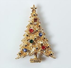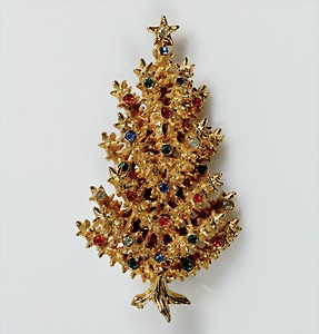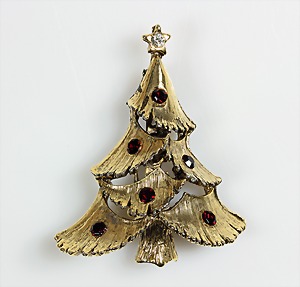 Weihnachtsbaum-Brosche, goldfarben, sig. JJ (Jonette Jewelrys, USA); dunkelrote Strasssteine, ca. 43 x 35 mm