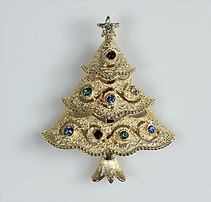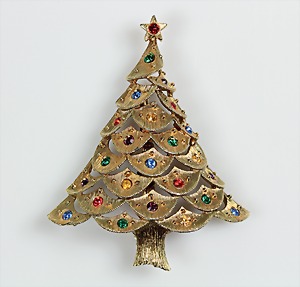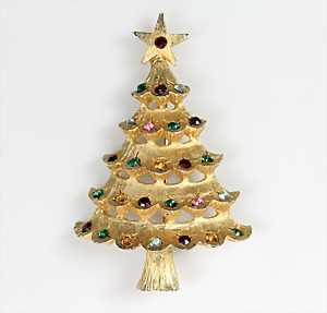 Weihnachtsbaum-Brosche, goldfarben, sig. ART; winzige bunte Strasssteine, plastische Form, ca. 60 x 32 mm
