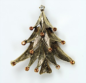 Weihnachtsbaum-Brosche, goldfarben, signiert JJ (Jonette Jewelry, USA); Strasssteine im warmen Orange-Ton, ca. 45 x 42 mm