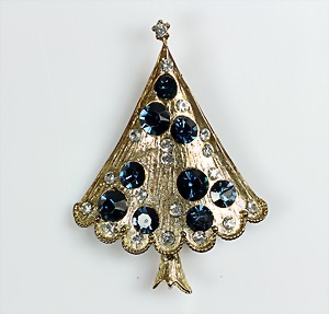 Weihnachtsbaum-Brosche, goldfarben, sig. WEISS; dunkelblaue und klare Strasssteine, ca. 64 x 45 mm