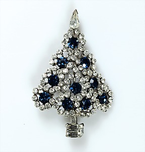 Weihnachtsbaum-Brosche, silberfarben, sig. LISNER; kleine klare und größere blaue Strasssteine, ca. 60 x 49 mm