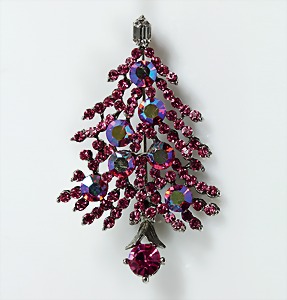 Weihnachtsbaum-Brosche, silberfarben, sig. LISNER, kleinere und größere Strasssteine in Rose, ca. 61 x 38 mm