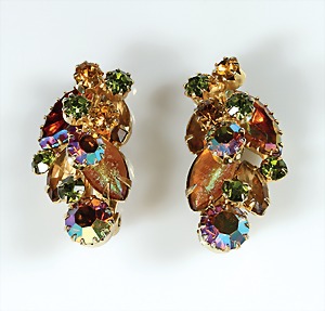 Schimmernde Strassclips von Kramer, USA (signiert). Goldfarbene Fassung. Mehrlagige, florale Form; unterschiedliche Steine in warmen Gelb-, Orange- und Grüntönen. H = ca. 32 mm