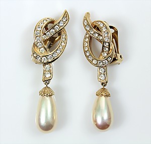 Goldfarbene Ohrclips von Atwood & Sawyer, UK (sig. A & S). Strassbesetzte Schleife mit tropfenförmiger Kunstperle als Abhängung, H = ca. 53 mm