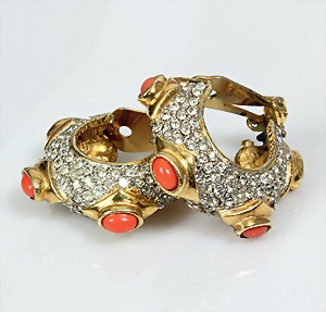 Üppig besetzte, goldfarbene Halbcreolen; klarer Strass und korallfarbene, ovale Glascabochons. Sig. K.J.L. (Kenneth Jay Lane), D aussen ca. 35 mm, Sammlerstück.