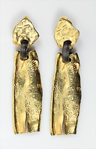 Exklusive Designer-Ohrclips von Delphin Nardin, Paris (signiert). Lange goldfarbene Clips mit Abhängung; unregelmäßige Form und Oberflächenstruktur, H = ca. 87 mm