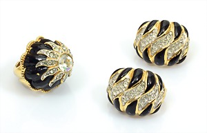 Set: a.) Ohrclips mit klarem Strass und schwarzer Emaille-Auflage von Kenneth Jay Lane (Signiert KLJ). b.) Passender Fingerring in massiver Ausführung von KJL. RW ca. 51