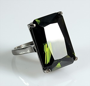 Silberfarbener Cocktail-Ring (unsigniert) mit einem großen geschliffenen Glasstein in Dunkelgrün, ca. 25 x 18 mm, RW ca. 56