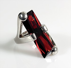 Silberfarbener Cocktail-Ring (unsigniert) mit einem geschliffenen Glasstein in Dunkelrot, ca. 34 x 13 mm, RW ca. 51,5