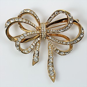 Goldfarbene Brosche in Form einer Schleife. Fein gearbeitet, klarer Strassbesatz. Sig. K.J.L. (Kenneth Jane Lane, USA), ca. 62 x 66 mm